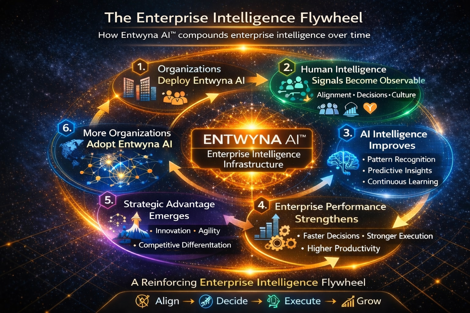 Modern enterprises operate on powerful technology systems, yet the human intelligence that drives decisions, alignment, and execution remains largely unmanaged. Entwyna AI™ introduces the Enterprise Intelligence Layer that enables organizations to observe, understand, and improve how they think, align, and execute.